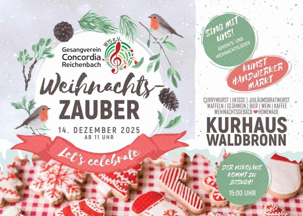 Mit dem CONCORDIA Weihnachtszauber am Sonntag, den 14. Dezember ab 11 Uhr im Kurhaus wird ein außergewöhnliches und ereignisreiches Jubiläumsjahr sein Ende finden. Ein weihnachtlich hergerichteter Kurhaussaal mit zauberhaft dekorierten Hütten, einem Speise- und Getränkeangebot sowie mehreren Kunsthandwerkerständen wird für ein ganz besonderes Ambiente sorgen und die Besucher auf die bevorstehenden Festtage einstimmen. Es ist an diesem Tag wieder mehrmals ein gemeinsames Advents- und Weihnachtsliedersingen mit den Besuchern angesagt. Auch die CONCORDIA Chorgruppen werden für beste Unterhaltung sorgen. Zudem wird der Nikolaus den kleinen Gästen einen Besuch abstatten.