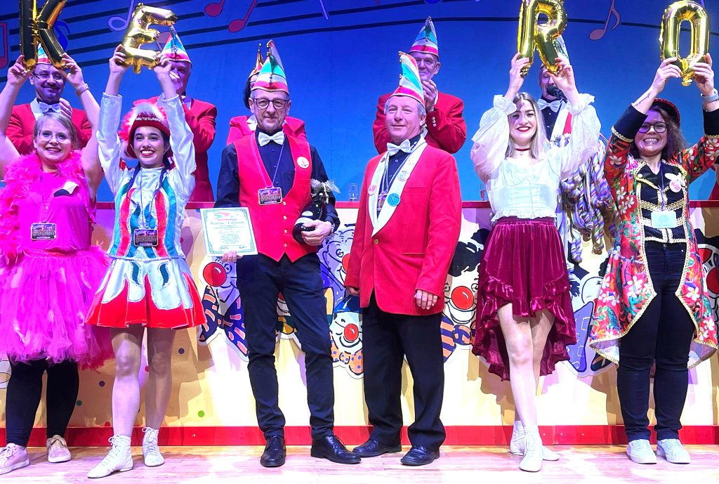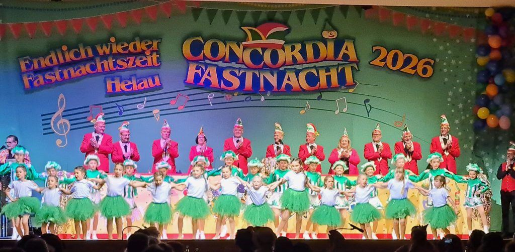 Bereits beim Mottolied, gesungen von „The Mottos“ (Leitung Nicole Neusesser), wurden die Besucher auf einen stimmungsvollen Abend eingeschworen. Stimmungsvoll war auch der Auftritt des Narrenchores unter der Leitung von Christian Seitz, der wieder gekonnt die musikalische Begleitung des kompletten Abendprogramms übernahm. Neben einem Rückblick auf das 150. Jubiläumsjahr mit all seinen Events wurden von den Sängern kommunalpolitische Themen eindrucksvoll gesanglich präsentiert. Eine weitere tolle Stimmungsnummer weckte Erinnerungen an das Jahr 1975, dem 100. Geburtstag der CONCORDIA. Über den damaligen Auftritt der drei Stargäste Heino und des Duos Gitti und Erika wird heute noch gesprochen. 51 Jahre später wurden sie hervorragend imitiert von Gundi Bechtel und Margrit Kuderer als Gitti und Erika und von Jürgen Fody als Heino. Es wurde aber nicht nur gesungen und geschunkelt. Was wäre eine CONCORDIA Prunksitzung ohne ihre Tanzgarden mit ihren begeisternden Auftritten? Mit ausgefeilten Choreografien, beeindruckenden Showelementen und tollen Kostümen rissen die vielen Aktiven dieser Garden das Publikum förmlich von den Sitzen. So sorgten zu Beginn das Tanzmariechen Vianne Kunz, trainiert von Petra Becker, mit sensationellen akrobatischen Elementen und die von Vianne Kunz selbst geleitete CONCORDIA Kindergarde mit dem Kindermarsch gleich für eine tolle Stimmung im Saal.